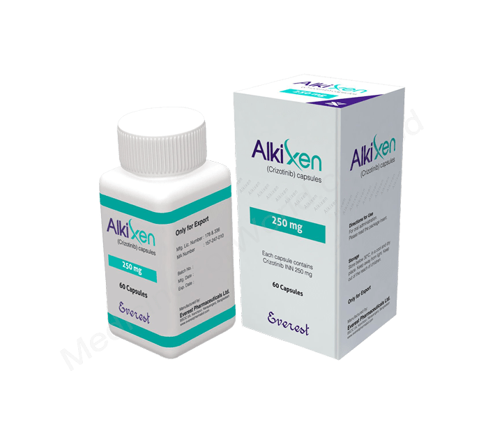 Crizotinib is an ALK inhibitor that targets abnormal ALK (anaplastic lymphoma kinase) proteins present in cancer cells. By blocking these proteins, Alkixen stops the signals that help cancer grow and spread.