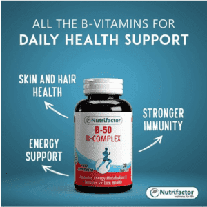 B-50 B-Complex is a high-potency supplement designed to provide essential B vitamins that support overall health and well-being. Manufactured by Nutrifactor, this dietary supplement helps in energy metabolism, nerve function, and red blood cell formation. It plays a crucial role in reducing stress, maintaining healthy skin, and promoting a strong immune system.
