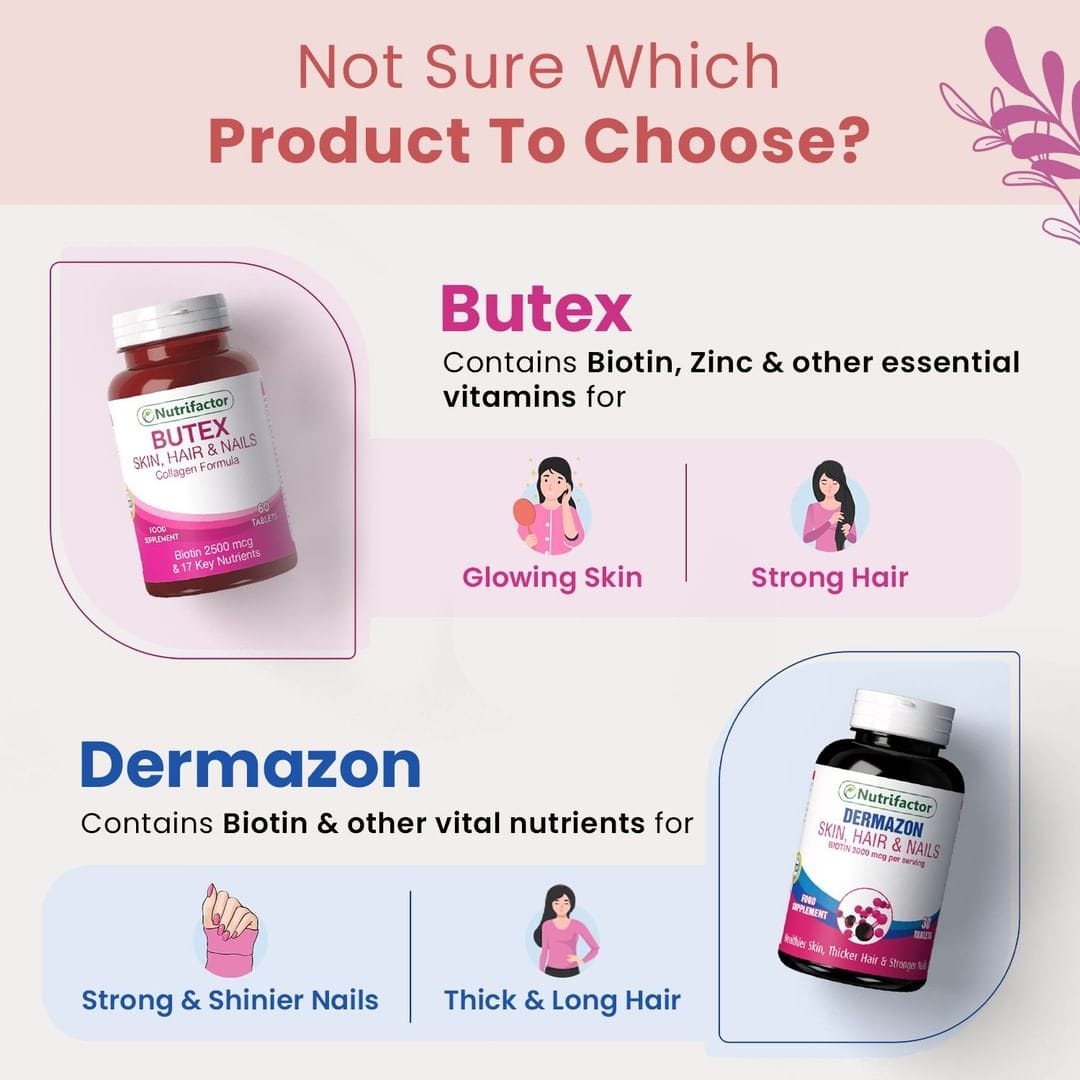 Butex is a comprehensive nutritional supplement meticulously crafted to enhance the health and beauty of hair, skin, and nails. Developed by Nutrifactor, a renowned name in the nutraceutical industry, Butex combines a balanced blend of 17 essential vitamins and minerals, along with Collagen and Sodium Hyaluronate, to provide a holistic approach to natural beauty from within.