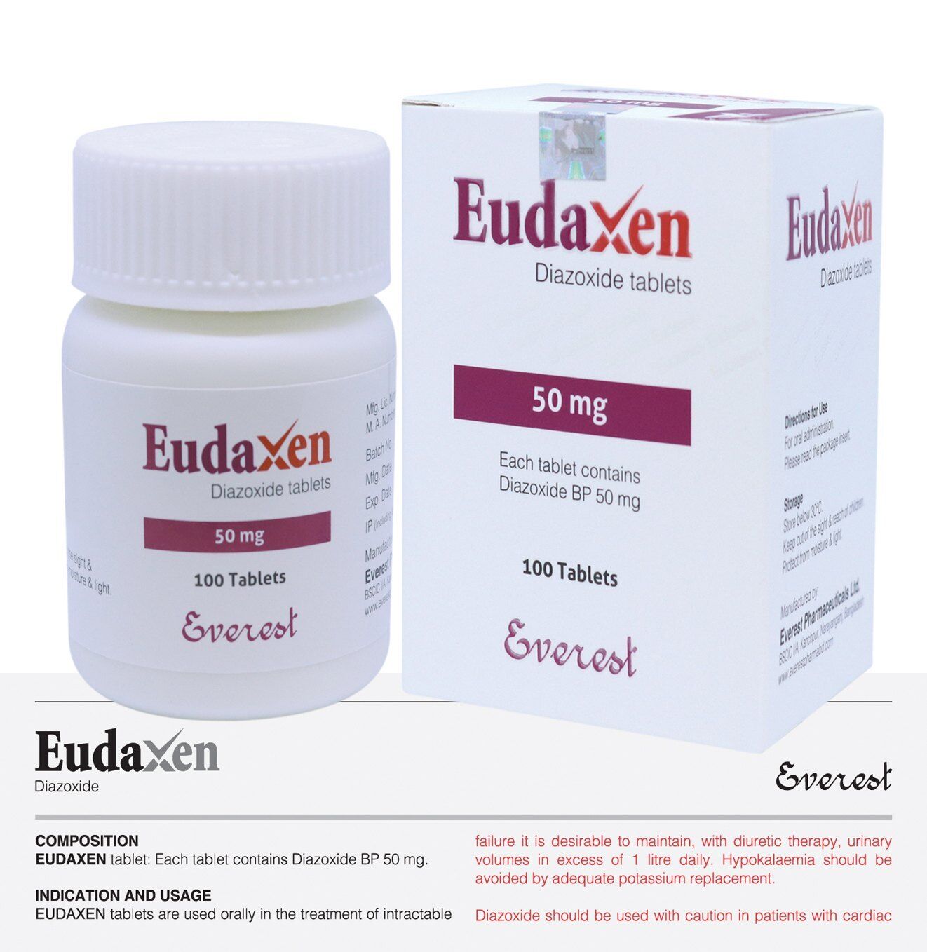 Eudaxen Tablet 50mg contains the active ingredient Diazoxide, which is a potassium channel activator used in the treatment of hypoglycemia (low blood sugar) due to insulin-secreting tumors and also in hypertensive emergencies. It works by inhibiting insulin release and relaxing vascular smooth muscles.